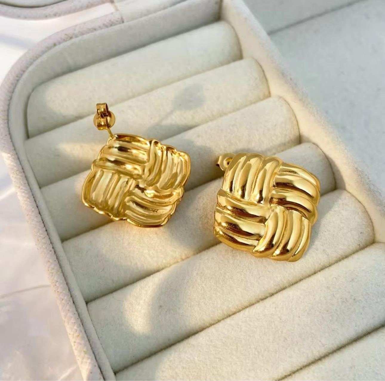 Expertly crafted with a sleek square shape, these gold-coloured earrings enhance any outfit with a touch of sophistication. Made with quality materials, they add a subtle yet luxurious statement to your look. Elevate your style with these timeless earrings.